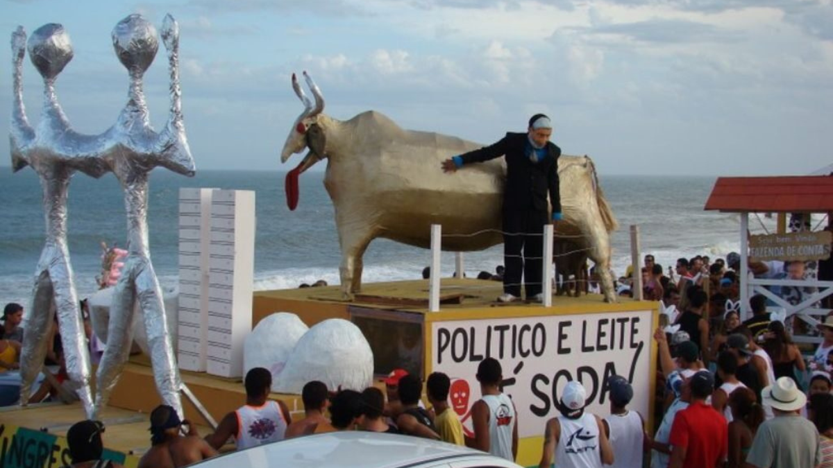 Mas o bloco vai além da crítica política. Histórias curiosas da Barra do Jucu também viraram enredo, como o “Ônibus do Desarranjo”, o “Monstro Marinho” e até uma “vaca voadora” que surpreendeu o público com efeitos cenográficos.